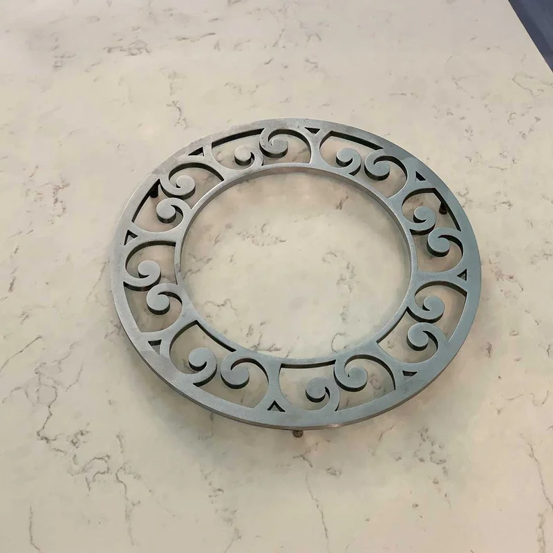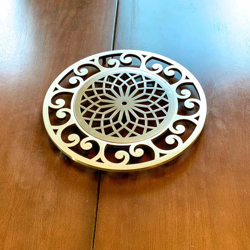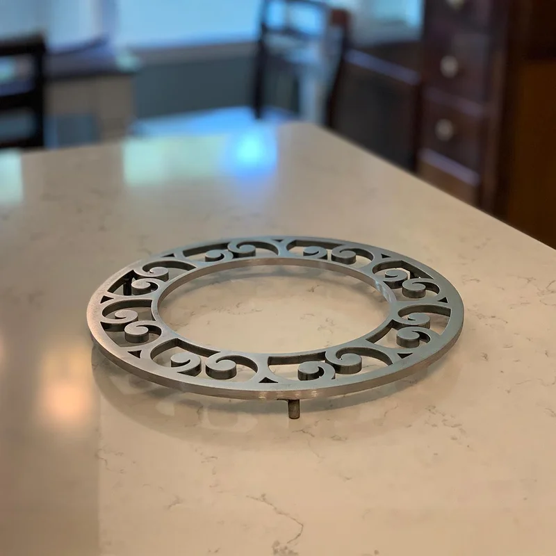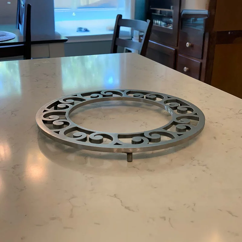 Outer Ring Diameter: 9.5" – Fits any 5.9" Trivet Creator trivets (SOLD SEPARATELY). Design: Golden spiral-inspired scroll pattern for a timeless, elegant look. Material: Sturdy steel construction with a durable finish. Use: Perfect for pairing with trivets for added protection and style; great for kitchen or dining tables. Gift Ready: Makes a wonderful add-on for weddings, anniversaries, housewarming gifts, or anyone who loves modular décor. Made to order – handcrafted with care in Texas
