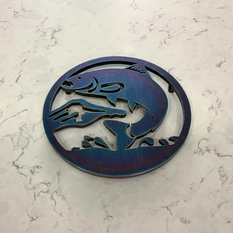 This handcrafted metal trivet features a striking Pacific salmon as its centerpiece, symbolizing the life and spirit of the Pacific Northwest. Behind it, the silhouette of majestic Mount Rainier rises, grounding the design in the region’s natural beauty. Both functional and artistic, it protects your surfaces while serving as a tribute to the wild rivers, towering peaks, and enduring heritage of the Northwest.
